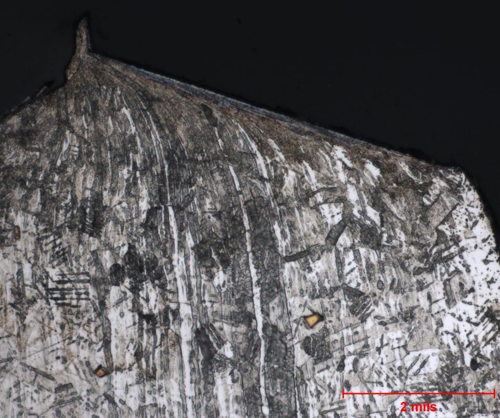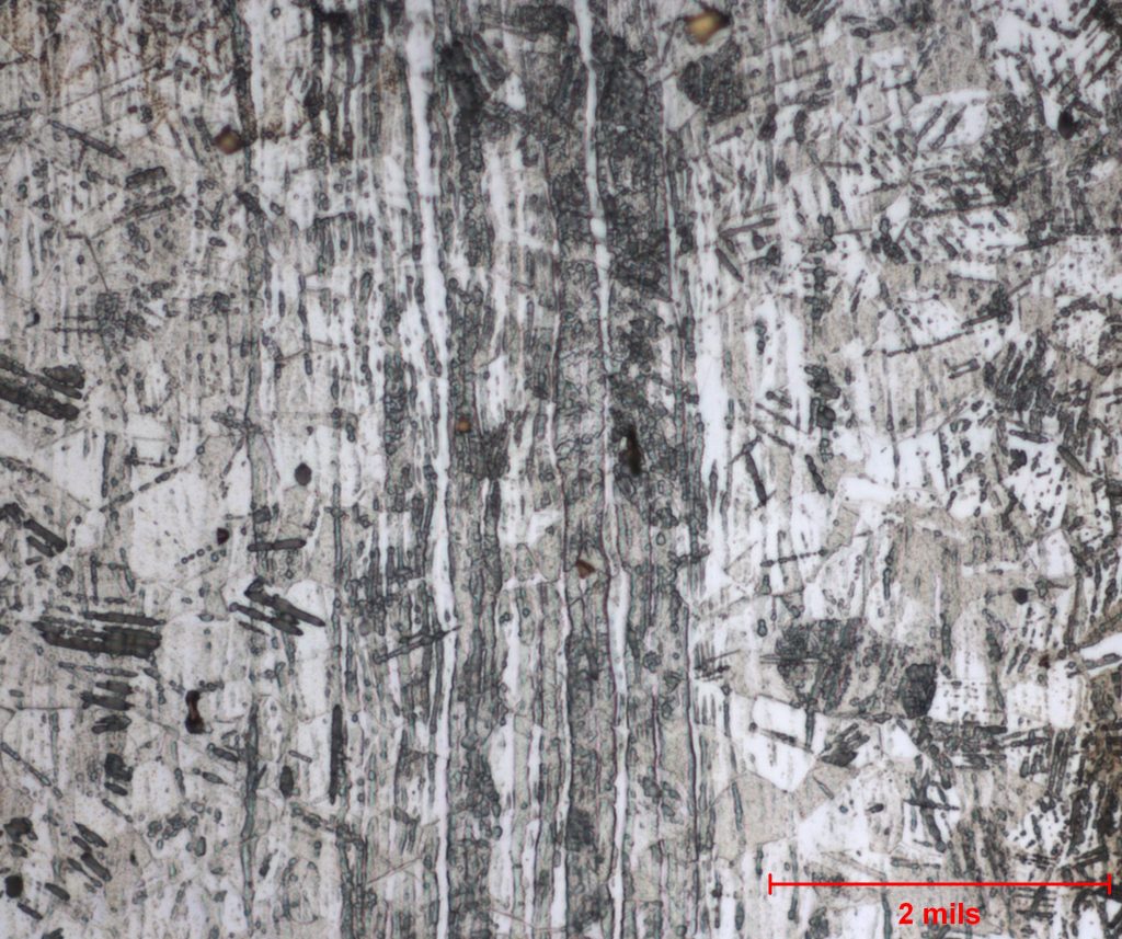 In the below photomicrograph, one can see the shear bands within the austinite grains forming and the transformation to martensite (black instead of white) within the grain boundary. Additionally, the direction of searing can be determined based on the direction of the cold work.